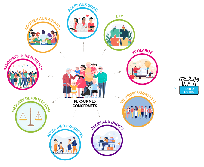 Vie quotidienne Trouver des ressources pour améliorer la vie quotidienne du patient/usager Accès aux soins ETP Scolarité Vie professionnelle Accès aux droits Accès médico-social Mesures de protection Association de patients Soutien aux aidants Boîte à outils